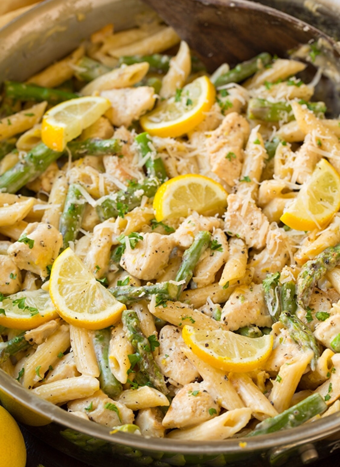 Add 3/4 of the chopped asparagus and the cooked pasta to the sauce and toss to coat.