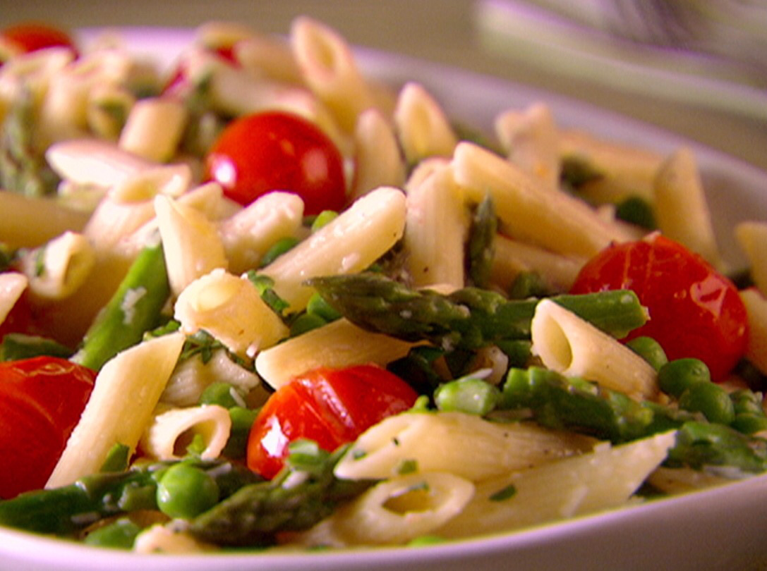 Transfer the asparagus mixture to a large serving bowl. Add the cooked pasta and 1/2 of the Parmesan. Toss well, adding reserved pasta water, if needed, to loosen the pasta. Garnish with the remaining Parmesan and chopped basil.