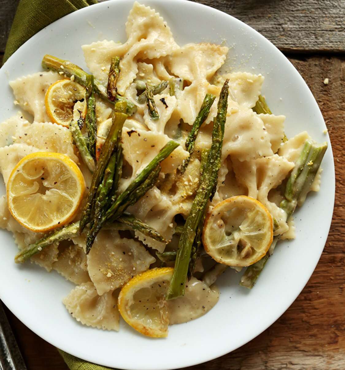 Divide between 2-3 serving plates and top with remaining asparagus. Serve with a lemon wedge and vegan parmesan cheese.