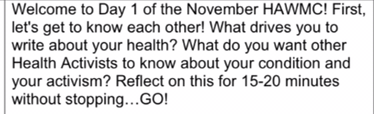 During the month of November, we’ll be holding another round of our Health Activist Writer’s Month Challenge (#HAWMC). We’ve prepared 30 health-related prompts that will help you get creative on your blog, instagram, facebook page, or health community all month long.