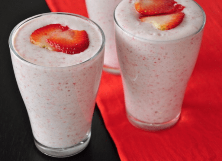 2 cups fresh or frozen strawberries 1 cup vitamin D-fortified whole, low-fat or skim milk or unsweetened almond, soy or coconut milk 1 ripe banana, peeled and sliced 1 tablespoon unsalted organic peanut butter 1 teaspoon organic vanilla protein powder like shakeology and add 12 small ice cubes