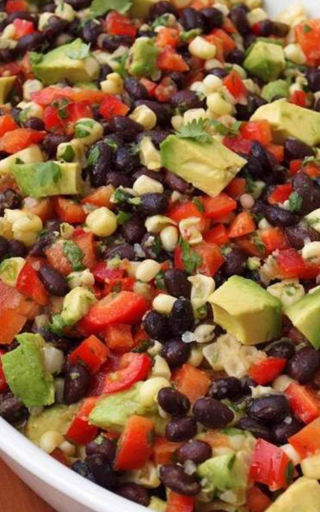 Combine all ingredients except for avocados in a large bowl and mix well. Cover and chill for a few hours or overnight. Right before serving, add avocados and mix gently, being careful not to mash avocados. Garnish with a more chopped cilantro if desired. Serve at room temperature.