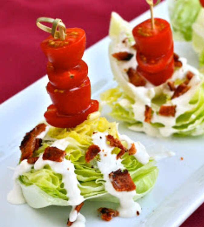 Spear 3-4 tomato halves with toothpick and secure into each lettuce wedge or stack. Drizzle with blue cheese dressing or whatever you like best and sprinkle with bacon bits optional (I used vegan bacon ) chopped onion , crumbled hard boiled egg what ever you want.