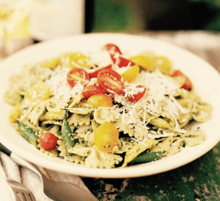* In a large bowl, mix pasta, beans, and 3/4 cup pesto. If more sauce is desired, add up to 1/4 cup more pesto. Top with cheese and halved cherry tomatoes.
