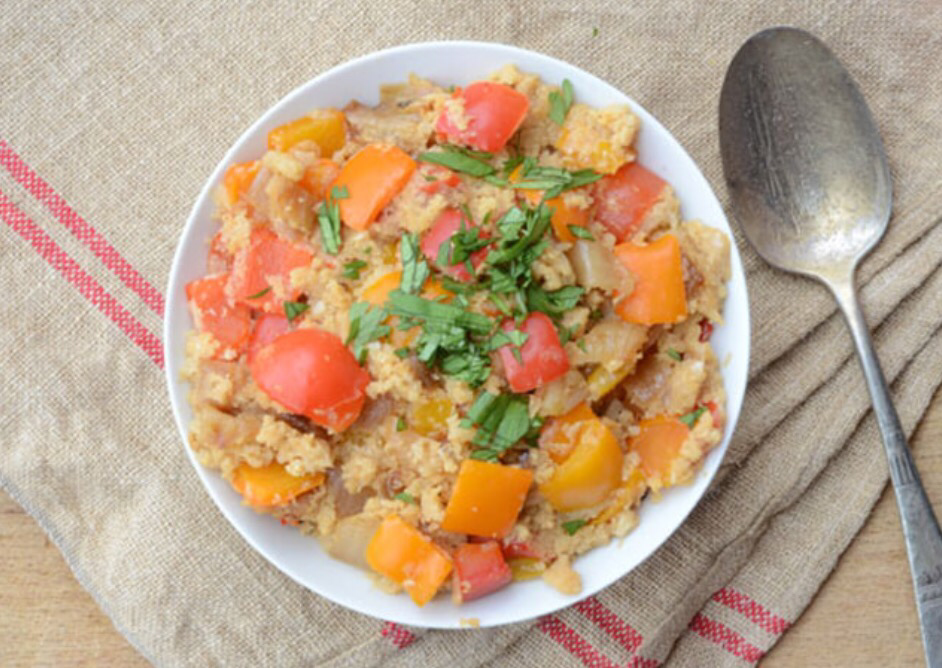 Stir in riced cauliflower, thyme, bay leaf, salt, pepper, chili, and cumin