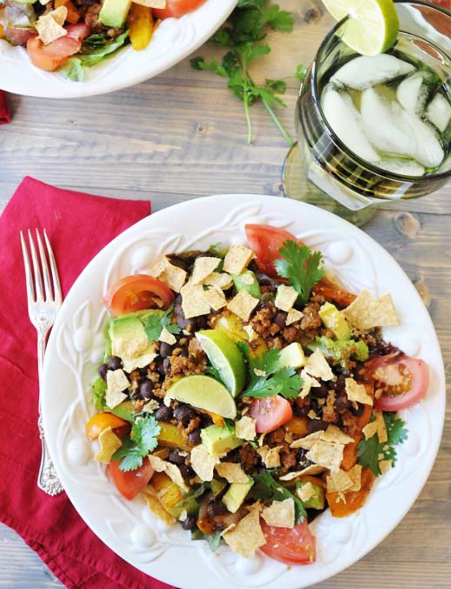 Happy Monday friends. Are you ready to start this brand spanking new week off right? I know I am, and this easy meatless Monday taco salad is going to make the sins of the weekend slip away like sand through an hourglass