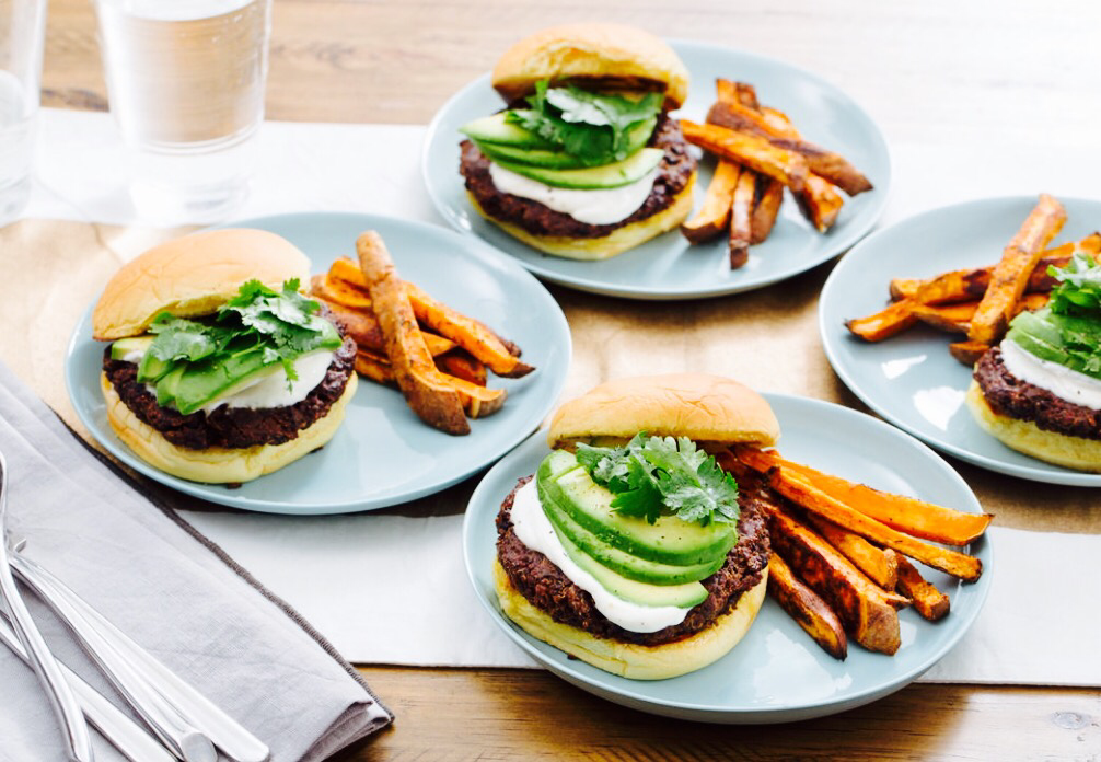 In the pan used to cook the burgers, heat 2 teaspoons of olive oil on medium-high until hot. Working in batches, add the buns, cut sides down. Toast 1 to 2 minutes, or until crispy and browned. Transfer to a plate. Divide the cooked burgers between the toasted bun bottoms. Top with the garlic-lime sauce, avocado, cilantro and bun tops. Divide between 4 plates and serve with the roasted sweet potatoes on the side