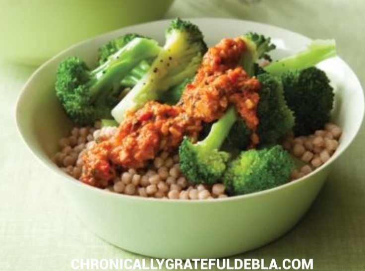 3. Steam broccoli 5 minutes, or until tender. Toss with oil and lemon juice in bowl. Divide couscous among bowls. Top with broccoli, then 3 Tbs. Sauce.