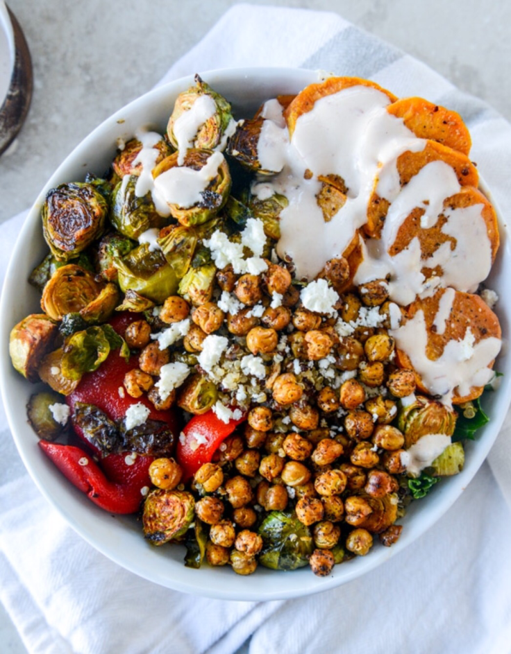 2. Veggies: The sweeter, the better. Think beets, sweet potatoes, butternut squash, and red bell peppers, onions, —leftovers come in handy here. Chop into bite-size pieces, and sprinkle over the grains.