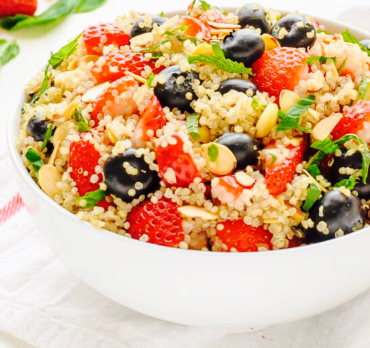 This healthy quinoa fruit salad is loaded with strawberries, blueberries, and a refreshing honey lime dressing.