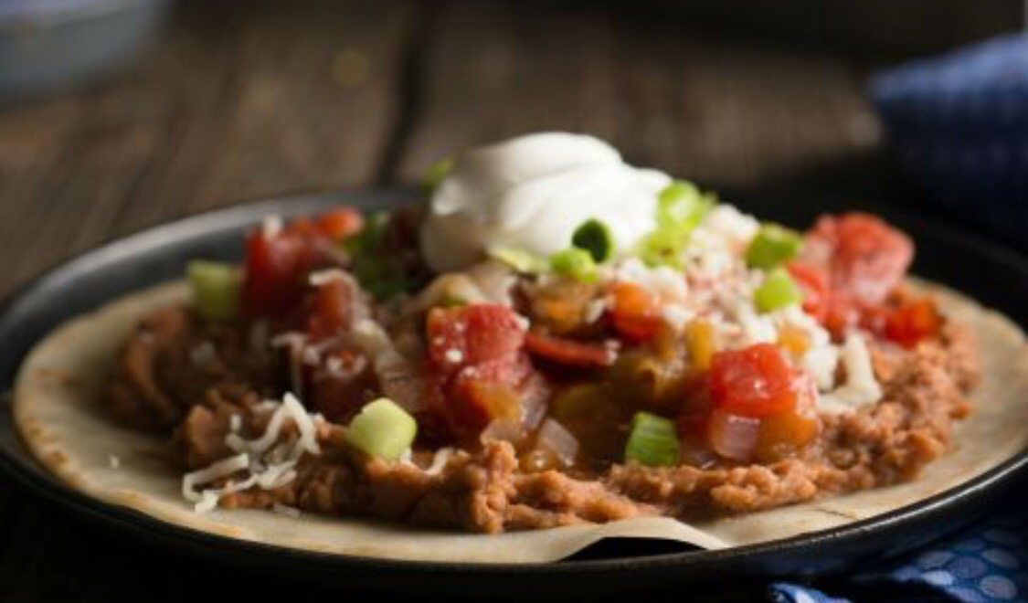 3. To serve, spread a thick layer of refried beans on each tortilla, then top with the tomato and chile mixture, then the Monterey jack cheese, cotija crumbles, and scallions. Serve warm, with sour cream.