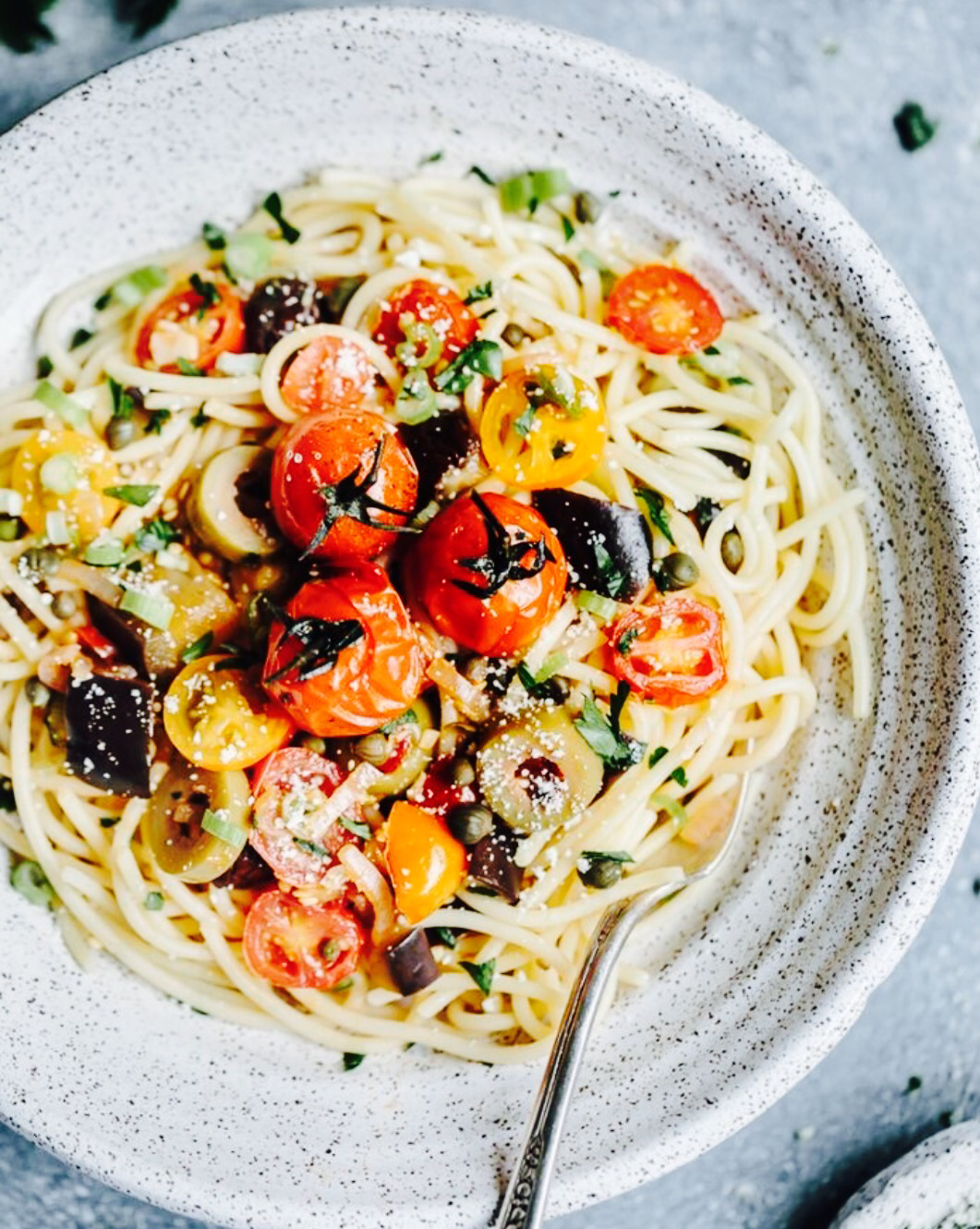 Eggplant and tomato sauce flavored with capers and green olives and mixed with quinoa spaghetti, fresh parsley, and Parmesan cheese.