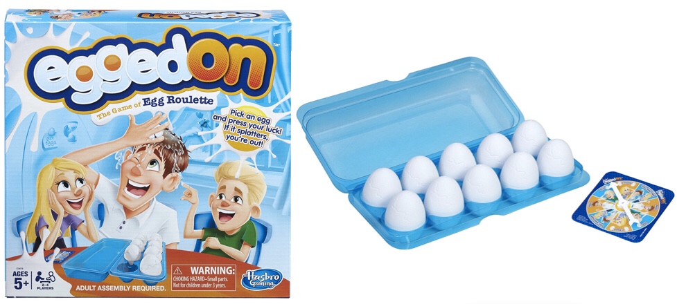 What’s slated to be the new “Pie Face” for 2017, Egged On is basically like a family-friendly Russian Roulette game where some eggs are filled with water and others are empty. Spin the wheel to see what you have to do (crack and egg over someone else, over yourself, and more) and then crack-that-egg!