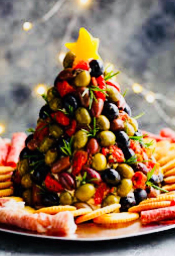 Then cover it completely wth antipasto ingredients! I used mixed olives and sun dried tomatoes for mine, and used a yellow bell pepper to cut out a star for the top!