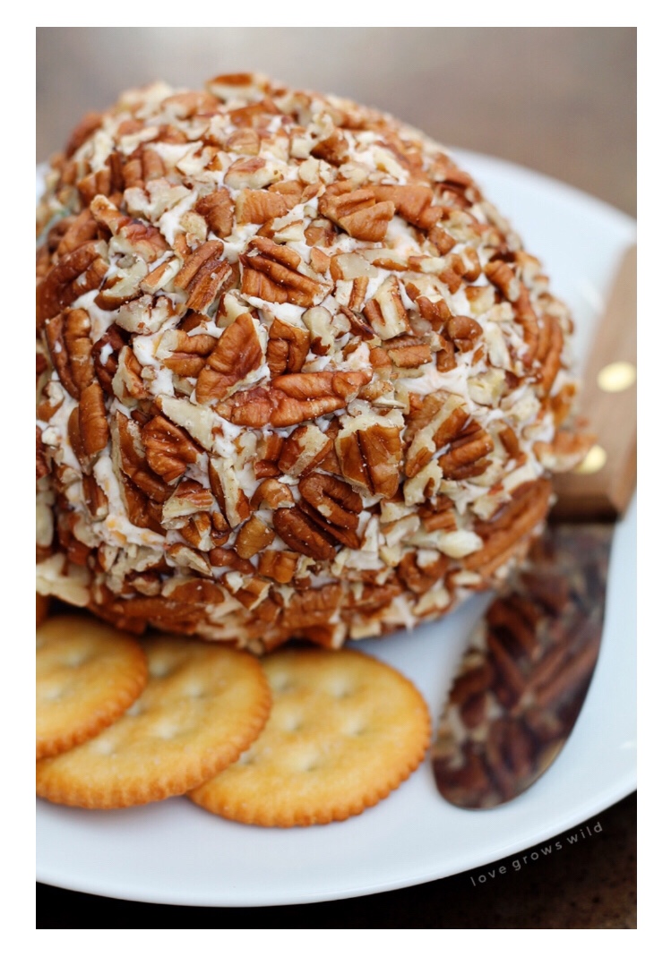 If you’re lazy, you could just use the dip like this and spread it onto crackers right out of the bowl, but if you like a good presentation then chop a couple handfuls of pecans and roll the cheese ball out in the pecans so it forms a tight round ball.