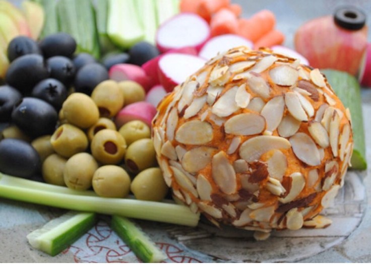 The cheese ball can be served as is or rolled in any variety of chopped nuts and or herbs. I used sliced almonds, but walnut pieces or pecan pieces with some fresh minced parsley, thyme or sage would be amazing.