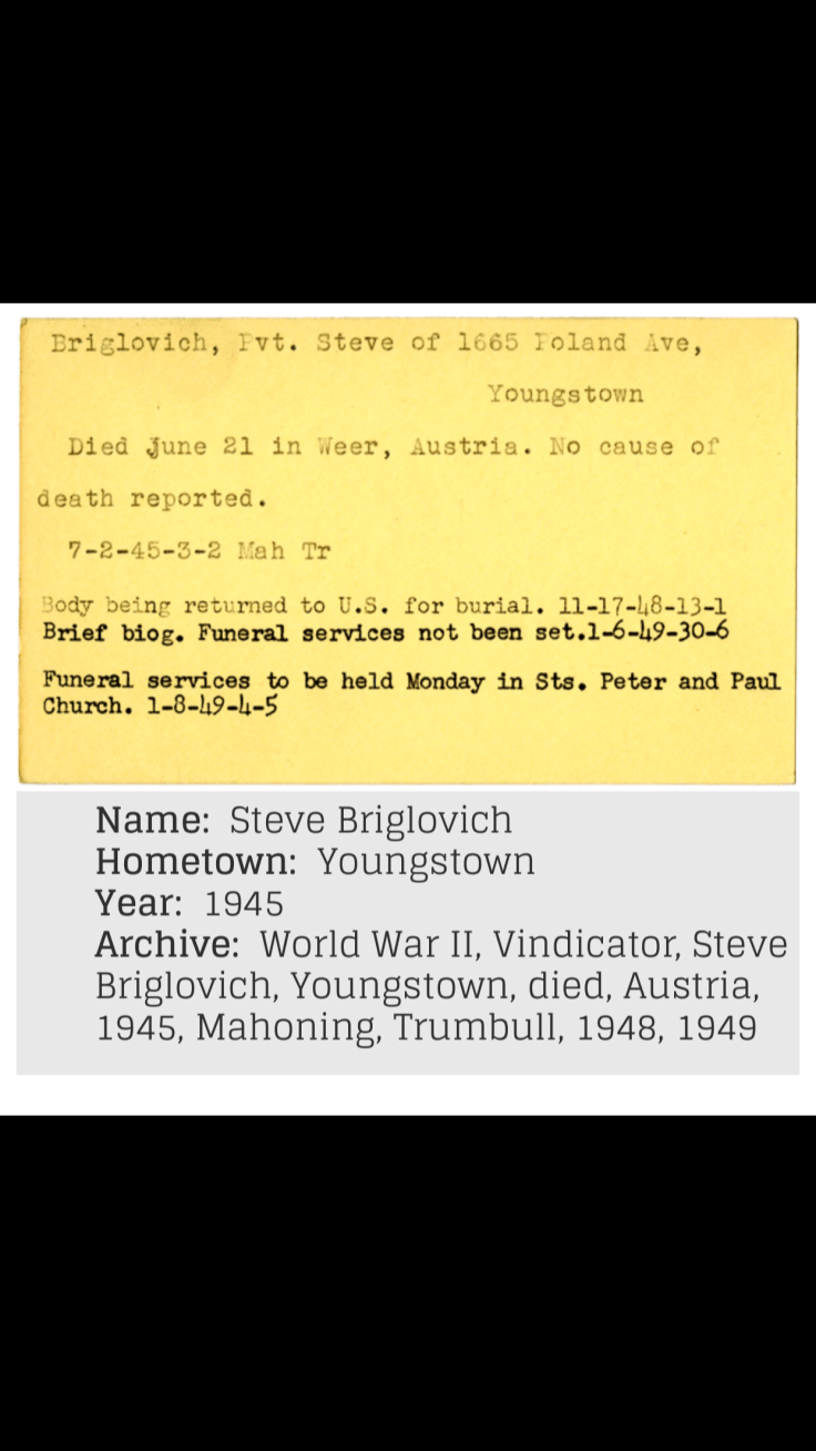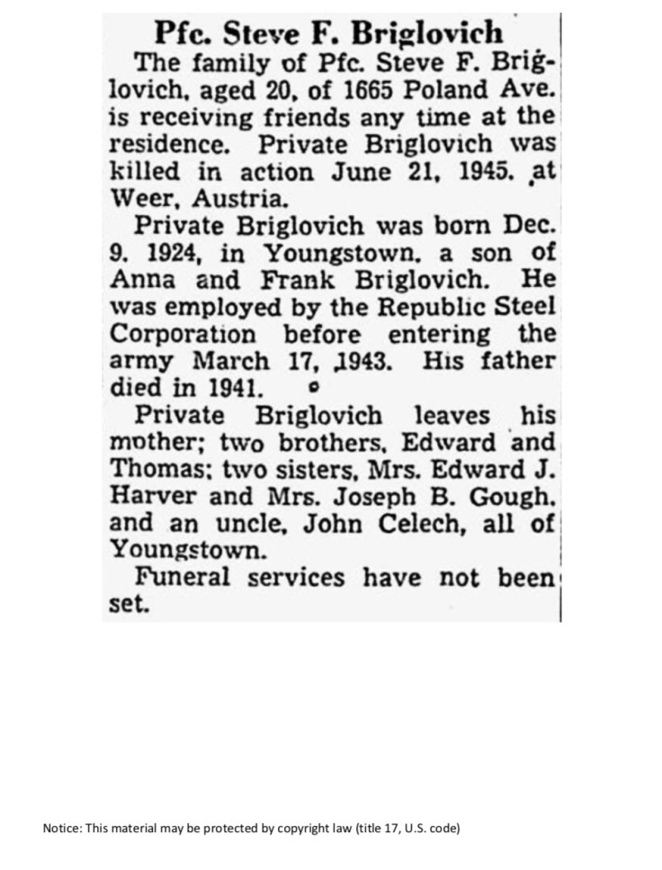 Died 21 JUNE 1945 WEER ,AUSTRIA but his body did not return home to the USA until November 1948 and his official funeral was January 1949 at Saints Peter and Paul Croatian Church in Youngstown Ohio.