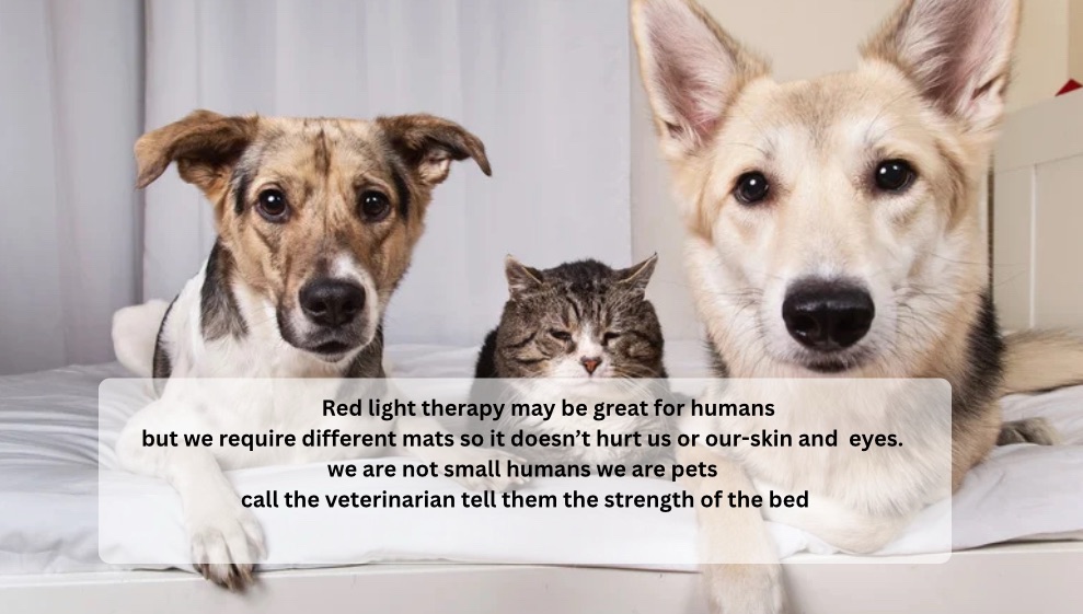 - Never use human red light therapy beds or devices on your pets. Our skin and eyes are more sensitive.